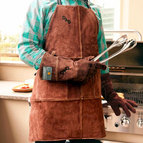 Grill in style with this heavy-duty leather apron and matching gloves! This comfortable apron, featuring a soft suede finish on the front along with several handy pockets, will protect you and your clothing from the perilous spills that come with outdoor cooking. Its soft cotton lining and adjustable straps provide a super comfortable fit. Custom branded with your initials usually on leather patches (not pictured). It's the perfect gift for the cook who has everything!
