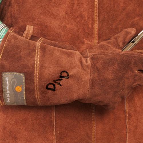 Protect your hands and wrists from the intense heat of the grill as well - these matching leather grilling gloves feature a soft suede finish and measure a lengthy sixteen inches to protect even more. A comfortable fit with improved dexterity allows each wearer to wield any grilling tool with ease. The right hand glove is custom branded to match your apron. The perfect gift for the dedicated grill master!
