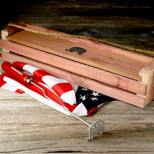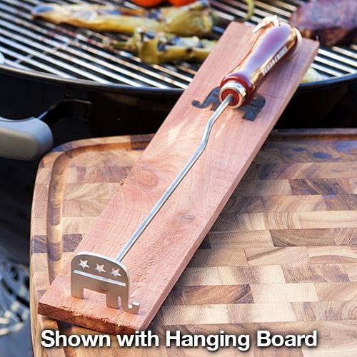 A Texas Irons original! This custom-made BBQ brand features the symbol of The GOP perfect for leaving your mark on just about anything. Made of durable stainless steel with a solid wood handle, it's designed to withstand even the hottest grilling heat. A great conversation piece at any cookout!